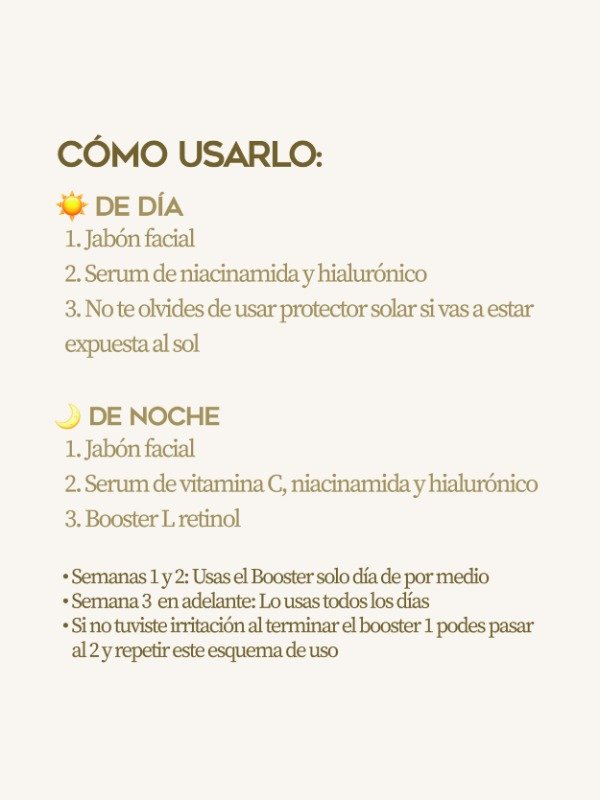 Una vez absorbido, aplicá dos o tres gotas del Booster L retinol y estirá por toda la cara hasta absorción completa.