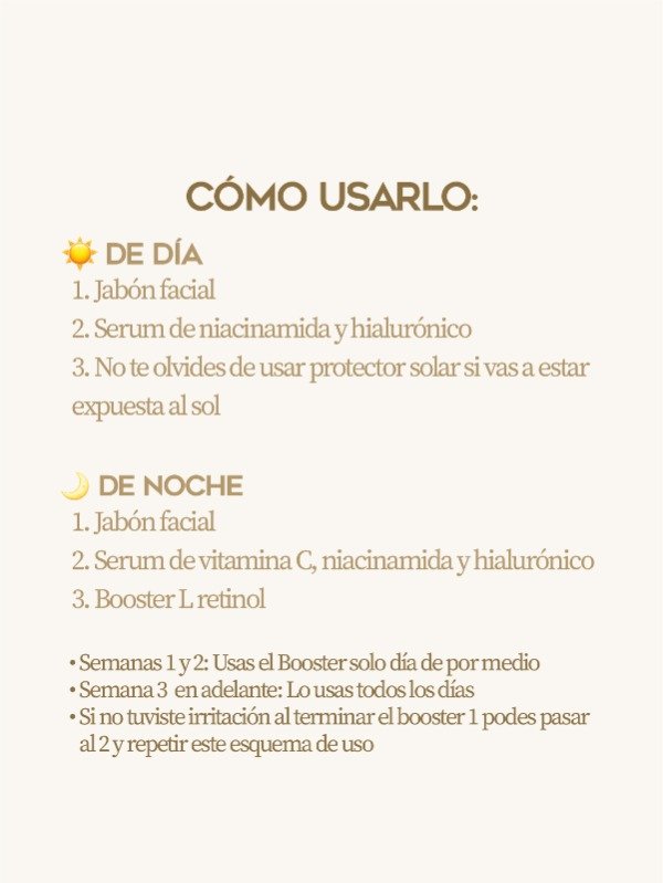 Una vez absorbido, aplicá dos o tres gotas del Booster L retinol y estirá por toda la cara hasta absorción completa.